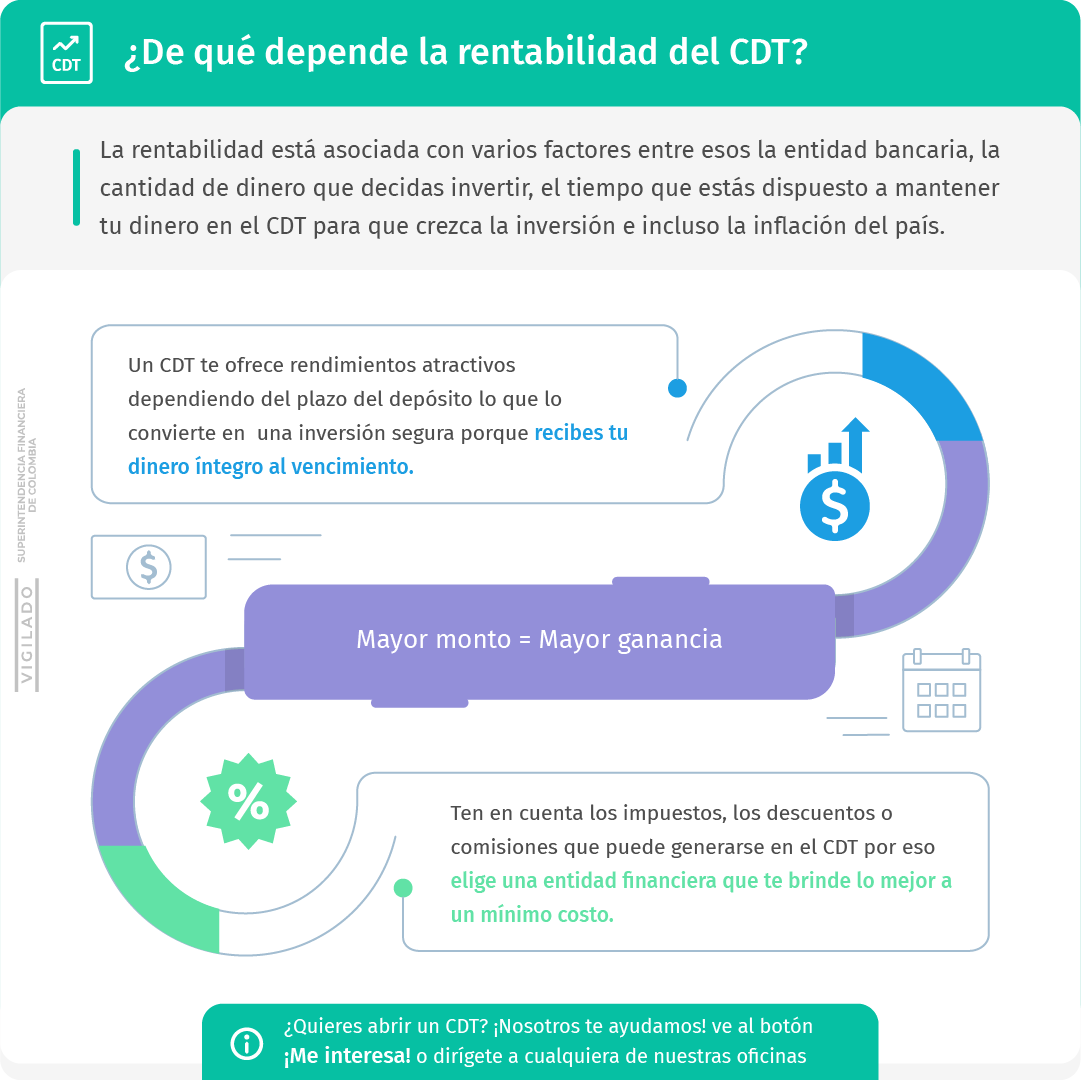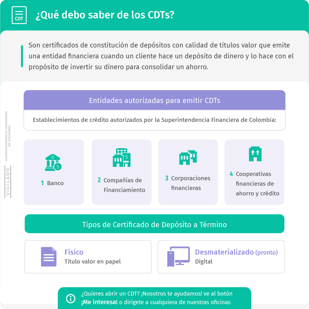 Un certificado de depósito a término o por sus siglas CDT es un producto que te brinda la posibilidad de guardar tu dinero y de recibir rendimientos sobre tu inversión a una tasa fija durante un plazo establecido no inferior a 30 días.